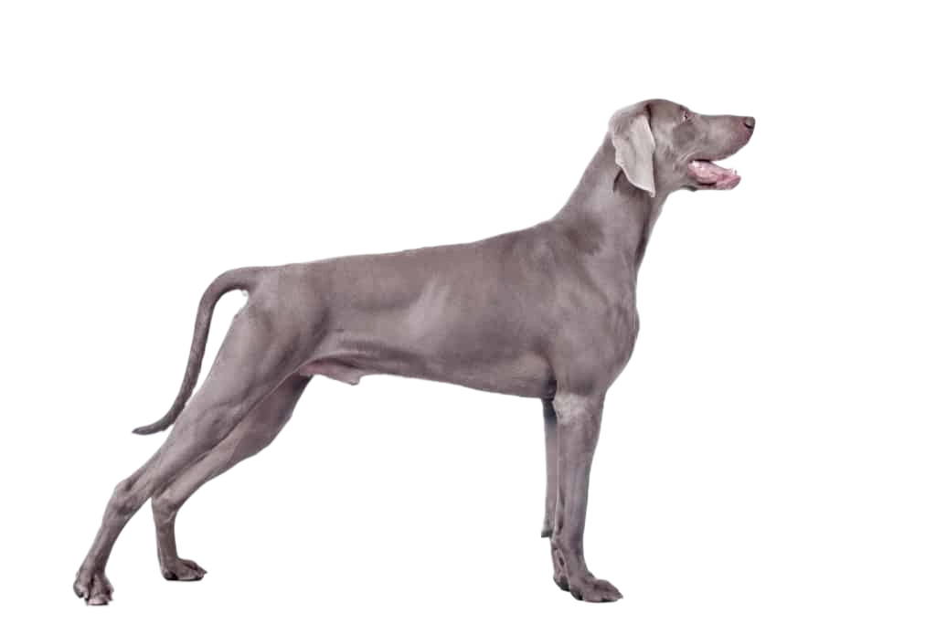 Der Weimaraner ist ein eleganter und athletischer Hund mit einem schlanken, muskulösen Körperbau. Sein kurzes, dichtes Fell schimmert in verschiedenen Silber-, Grau- und Mausgrautönen, was ihm ein unverwechselbares Erscheinungsbild verleiht. Die ausdrucksstarken, bernsteinfarbenen bis blaugrauen Augen unterstreichen seinen wachsamen und intelligenten Blick. Charakteristisch sind zudem die langen, hängenden Ohren, die ihm ein edles und aufmerksames Aussehen verleihen. Manche Vertreter der Rasse haben auch ein etwas längeres, welliges Fell, das ihnen ein besonders weiches Erscheinungsbild gibt. Sein harmonischer Körperbau und die geschmeidigen Bewegungen lassen erkennen, dass der Weimaraner ursprünglich als Jagdhund gezüchtet wurde.