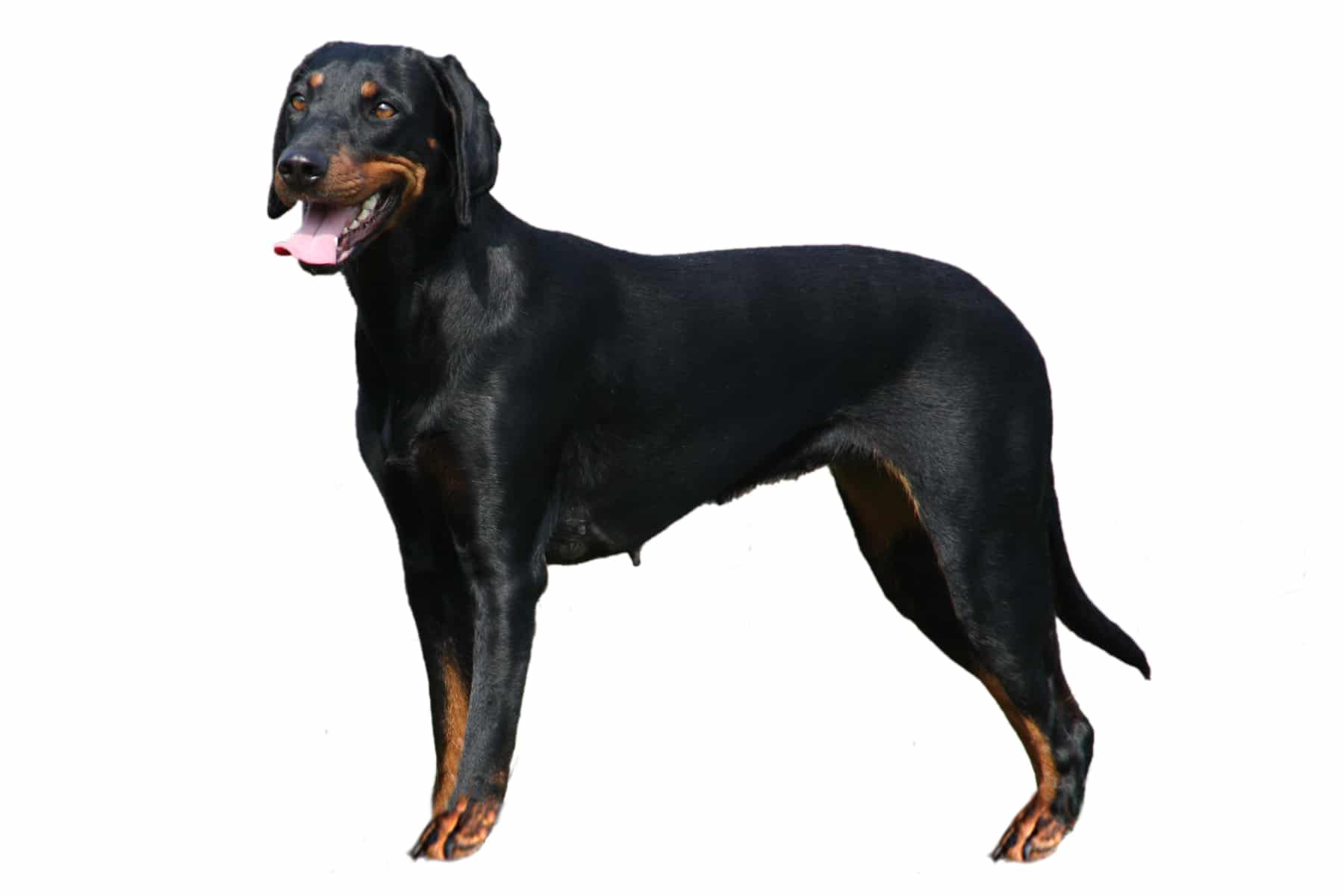 The Austrian Black and Tan Hound, also called "Vieräugl," is an elegant, medium-sized scenthound with a lean but muscular build. Its short, dense coat shows a striking black-and-tan pattern, with the tan markings above the eyes resembling extra eyes, earning it the nickname "Vieräugl" (four-eyes). The head is narrow and expressive, with dark, alert eyes that reflect intelligence and attentiveness. The long, close-fitting ears underscore its typical appearance as a hunting dog. Its build is harmoniously proportioned, with a deep chest and strong limbs that provide endurance and agility. The tail is medium length, slightly curved, and usually carried as an extension of the backline.