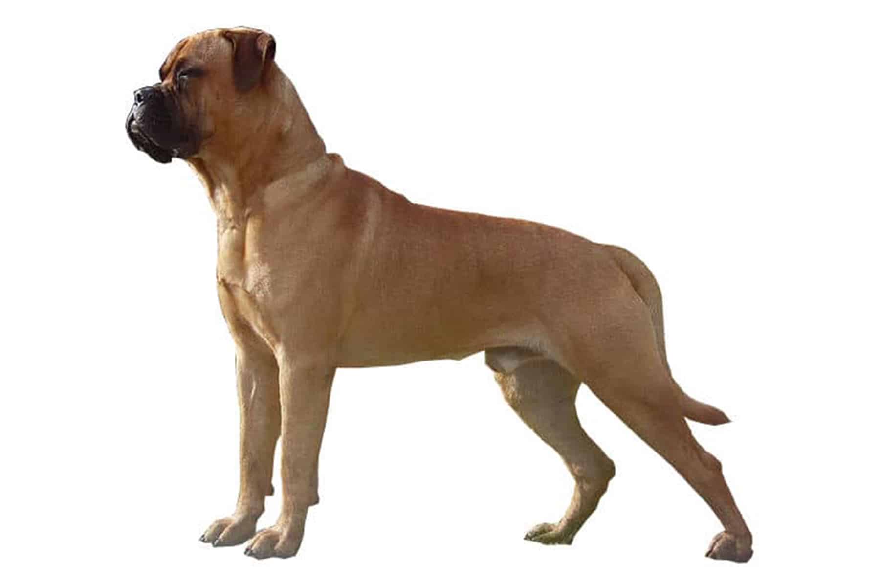 The Bullmastiff is a powerful and imposing dog with a muscular and compact build. Its short, dense coat lies close to the body and can appear in various shades of fawn, red, or brindle, often with a characteristic black mask on the face. The broad skull and pronounced cheek muscles give it a distinctive appearance, while the dark, alert eyes lend its expression intelligence and determination. The medium-sized ears are V-shaped and lie close to the head, underscoring its watchful and focused gaze. Despite its massive appearance, the Bullmastiff radiates an elegant calm and moves with powerful yet smooth strides.