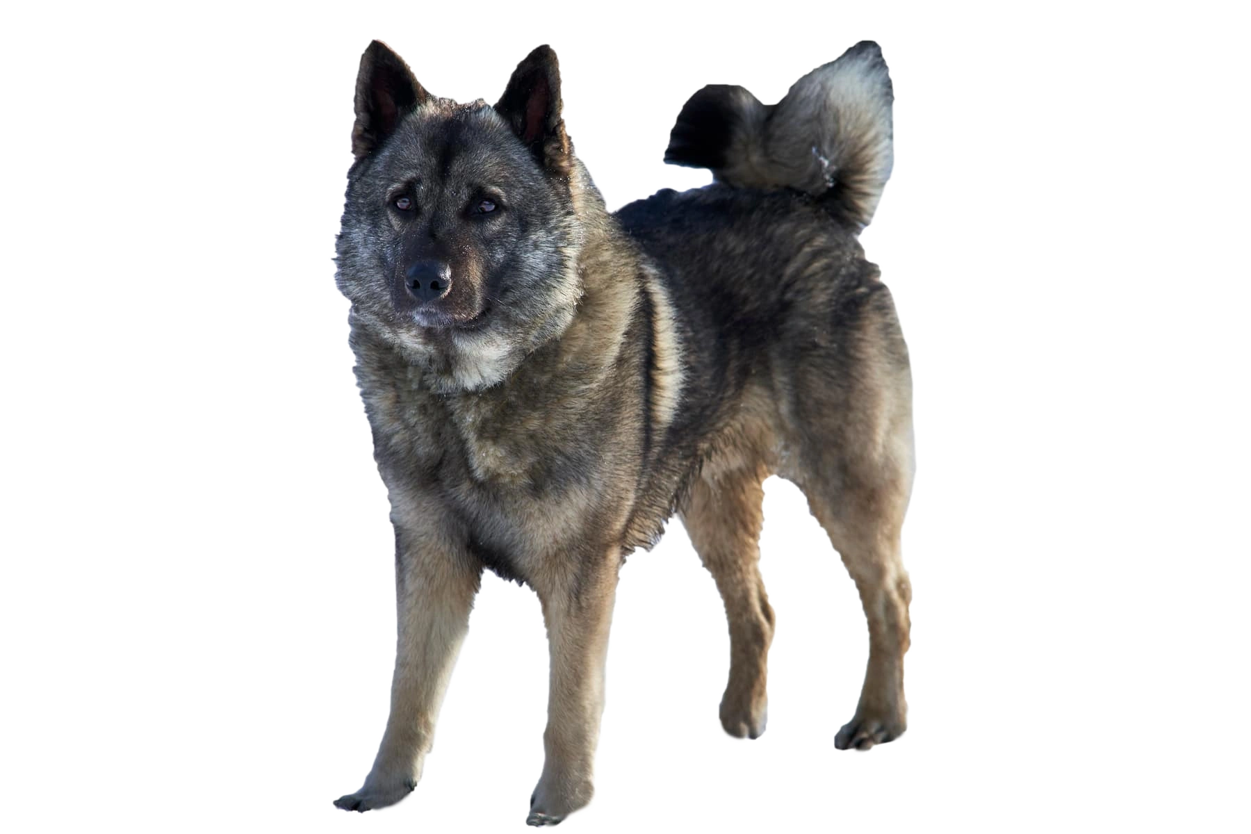 The Norwegian Elkhound Grey is a compact, powerfully built dog with a dense, weather-resistant coat that optimally protects it from harsh climates. Its medium-length, silver-grey to dark grey fur is backed by a soft undercoat that provides additional warmth. The build appears balanced and robust, with an upright posture and a slightly arched chest. Its pointed, erect ears give it a watchful and attentive appearance, while its bushy tail curled over the back is a typical feature of Nordic dog breeds. The dark, lively eyes underscore its intelligent and friendly expression, reflecting its close connection to people.