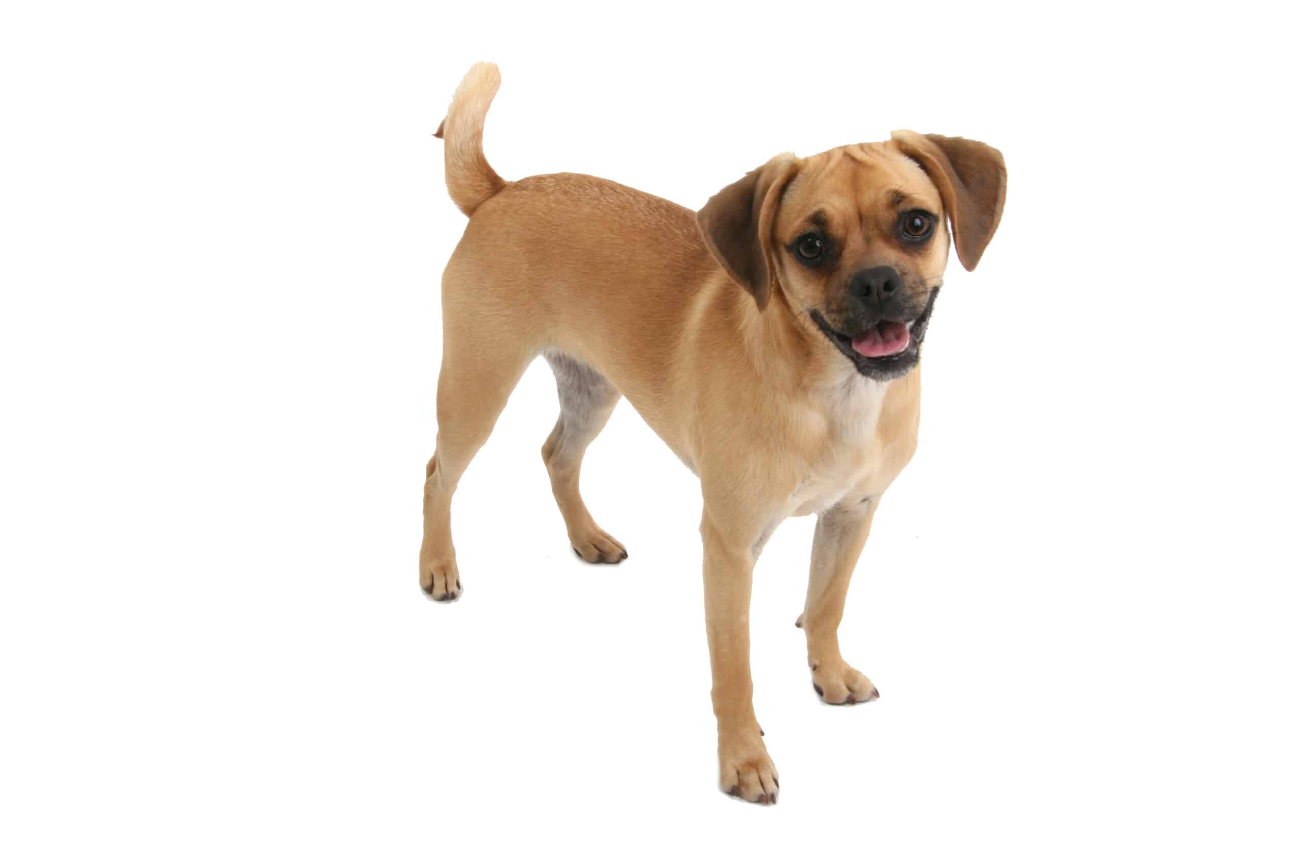 The Puggle is a charming mix of Pug and Beagle, which is clearly reflected in its appearance. It has a compact, well-proportioned body with sturdy legs and a slightly arched chest. Its head combines typical features of both breeds: it often displays the slightly wrinkled forehead and short ears of the Pug, while the longer muzzle and expressive eyes are reminiscent of the Beagle. Its coat is short, dense, and smooth, giving it a well-groomed appearance. The Puggle varies in color, with warm brown and beige tones being common, often with a black mask on the face. Its tail is usually slightly curled or gently curved, lending it a playful expression.