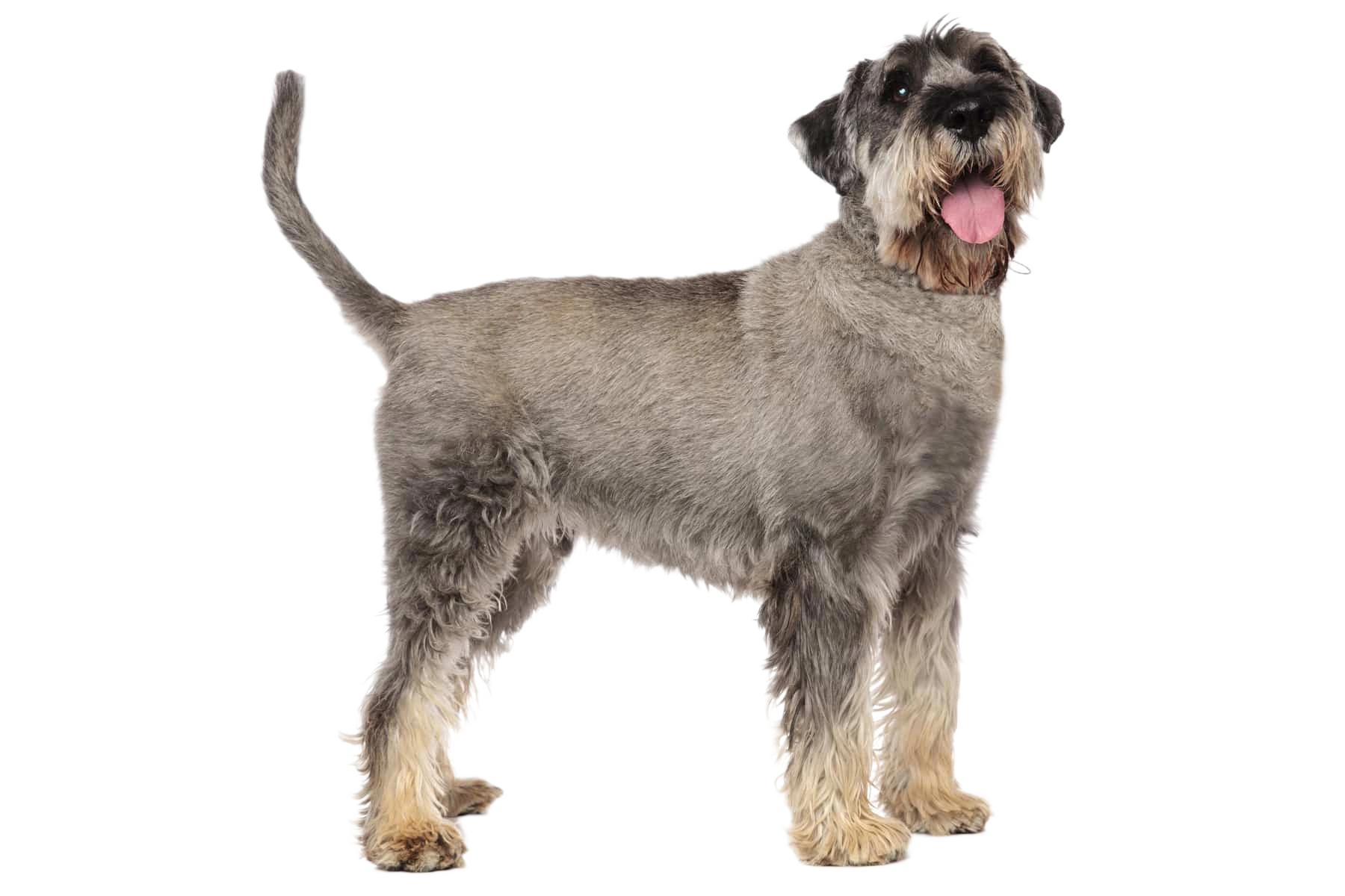 The Standard Schnauzer is a medium-sized, muscular dog with a compact and powerful build. Its dense, wiry coat gives it a distinctive appearance and protects it from wind and weather. Particularly characteristic of this breed are the bushy eyebrows that give it an alert expression, as well as the prominent beard that adorns its face. Coat colors vary, with pepper and salt and black being the typical colorings. With its well-proportioned limbs and upright posture, the Standard Schnauzer appears both elegant and robust.