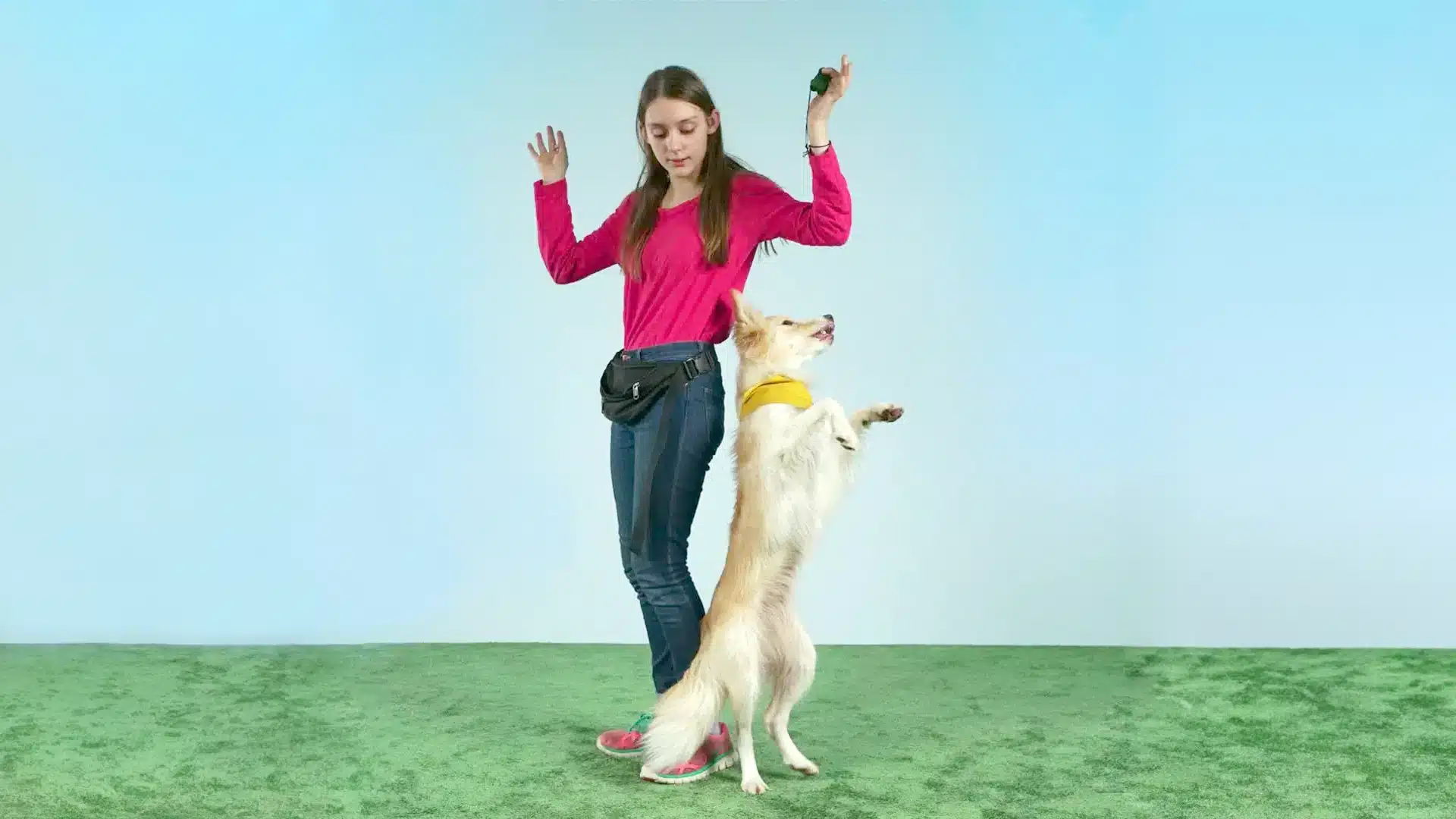 Jetzt gibst du ihm ein Handzeichen oder ein Wortzeichen wie „Zunge“. Jedes Mal, wenn dein Hund die Zunge zeigt, klickst du damit und gibst die Belohnung. Mit der Zeit konzentrierst du dich mehr auf das Hörzeichen und verwendest weniger Hilfsmittel. Übe intensiv, um diesen Trick zu festigen.