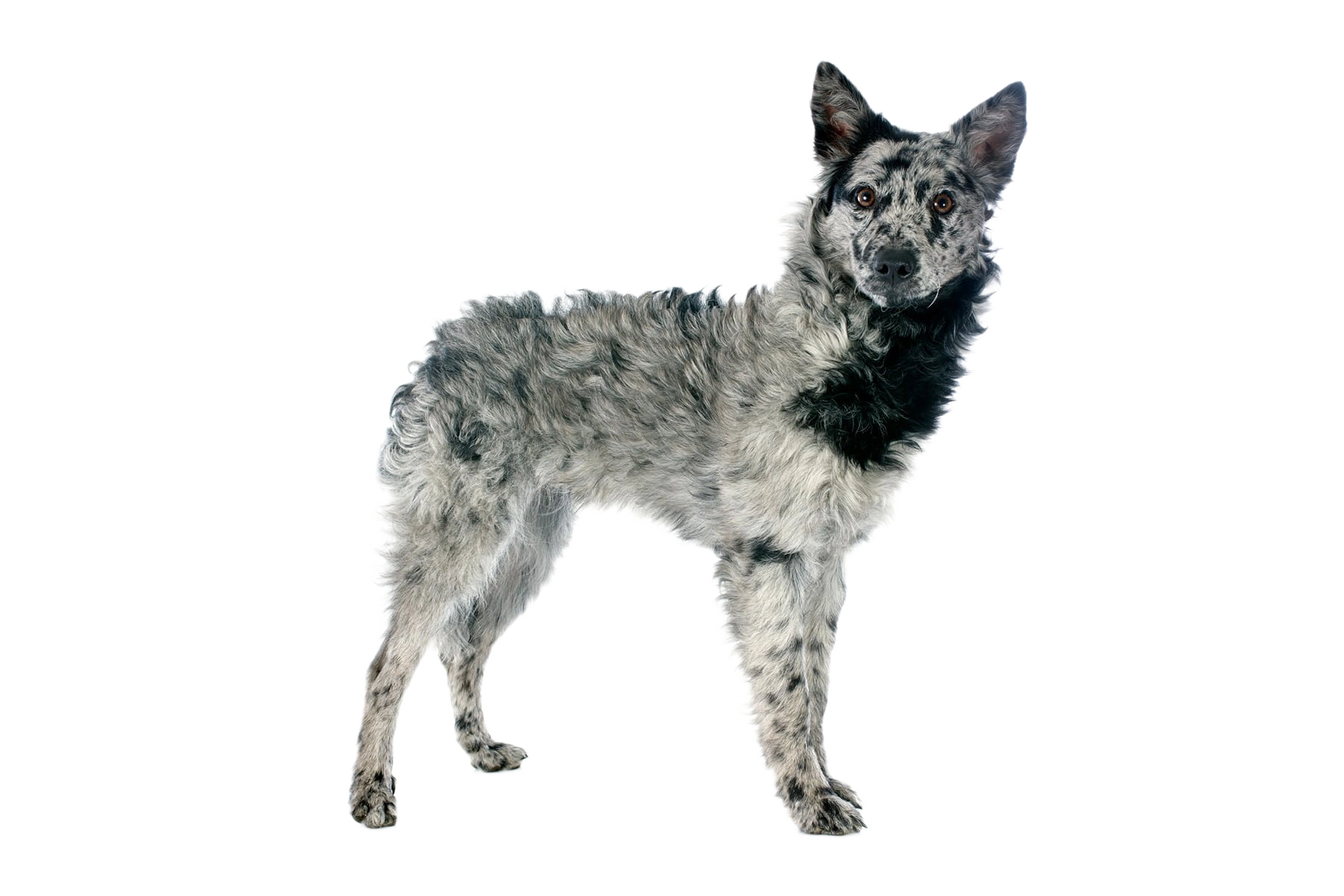 El Mudi es un perro de tamaño mediano y atlético con una constitución armoniosa y bien proporcionada. Su pelaje es ondulado a rizado y se siente bastante áspero, mientras que es más corto y liso en la cabeza y la parte frontal de las patas. La paleta de colores de esta raza es notablemente diversa, abarcando desde tonos sólidos hasta variantes raras. Particularmente llamativas son sus orejas erguidas, que le dan una expresión alerta y vivaz. Los ojos también reflejan su inteligencia y atención, generalmente en tonos oscuros que complementan perfectamente su rostro expresivo. En conjunto, el Mudi parece tanto elegante como robusto, ideal para su papel original como perro de trabajo versátil.