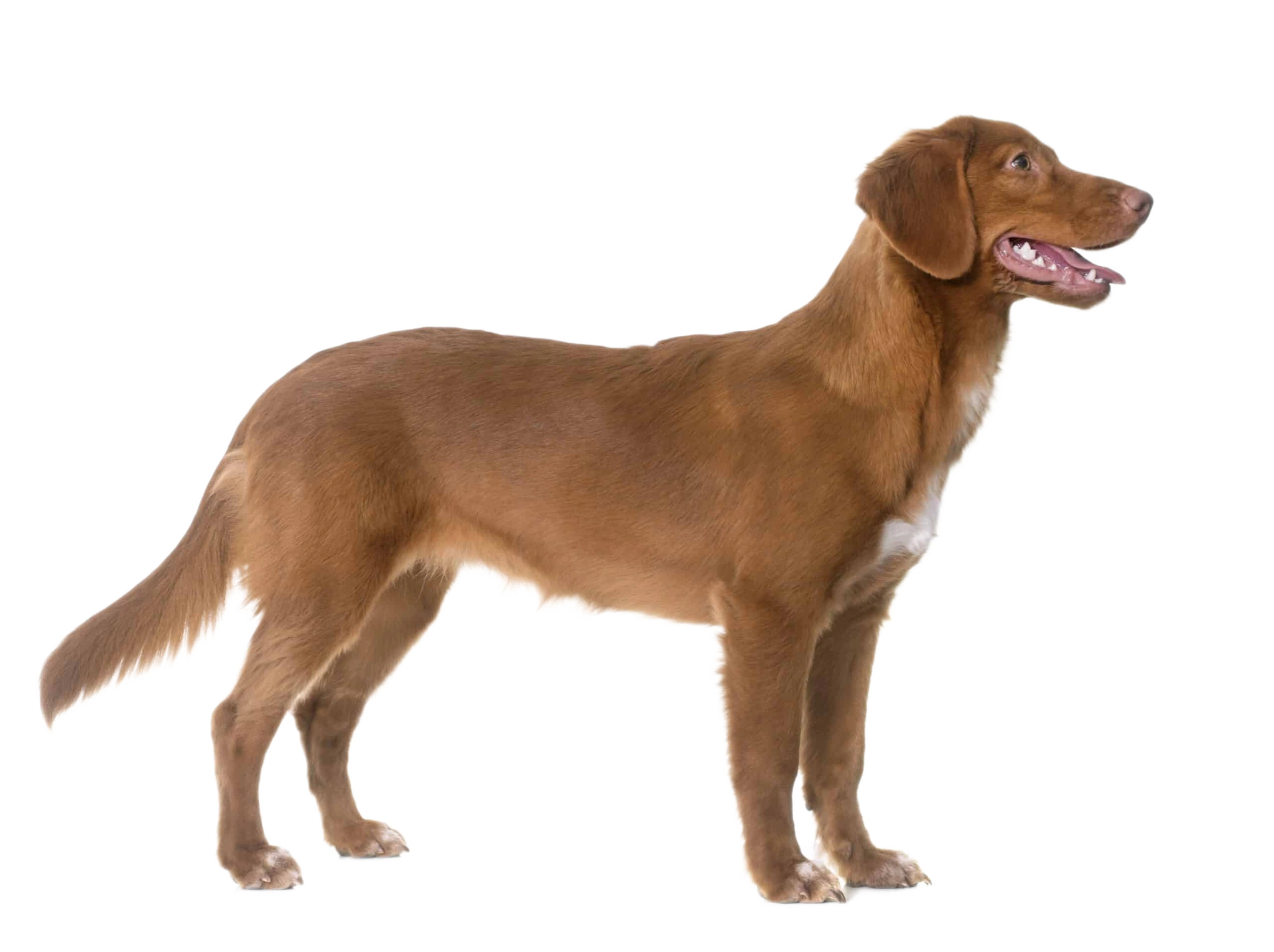 El Nova Scotia Duck Tolling Retriever es un perro de tamaño mediano, atlético, con una constitución armoniosa que combina fuerza y agilidad. Su pelaje denso e impermeable es de longitud media y presenta un suave subpelo que lo protege bien del frío y la humedad. Típicos de esta raza son los cálidos tonos rojos del pelaje, que pueden variar desde un dorado más claro hasta un rojo intenso, a menudo complementados con marcas blancas en el pecho, las patas o la punta de la cola. Los ojos almendrados irradian inteligencia y atención, mientras que las orejas bien emplumadas están insertadas a media altura y se inclinan ligeramente hacia adelante. Su cola tupida, que lleva animadamente en movimiento, subraya la presencia alerta y enérgica de esta raza.