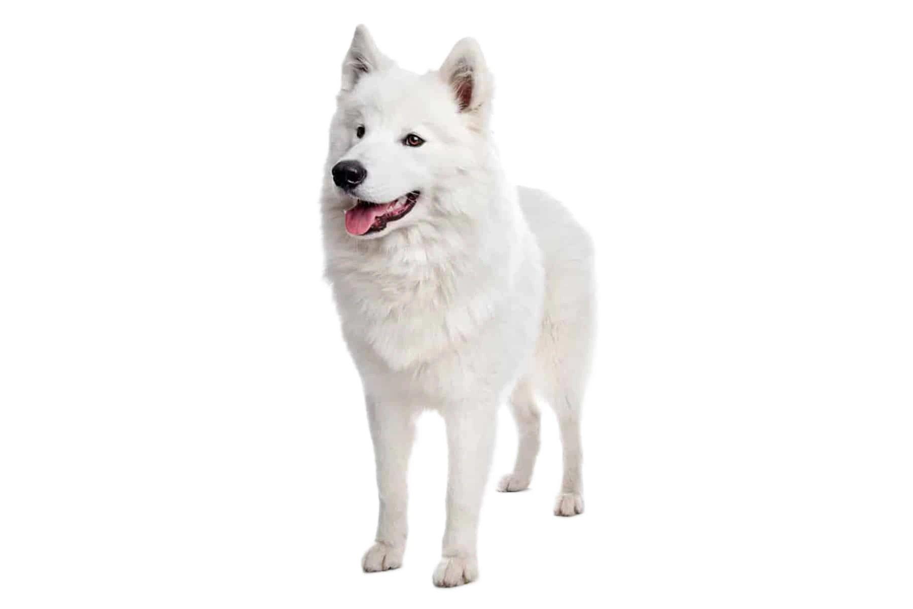 Il Samoyed è un cane di taglia media, dalla corporatura robusta, con un mantello fitto e resistente alle intemperie che lo protegge dal freddo gelido. Il suo pelo lussuoso, solitamente bianco neve, gli conferisce un aspetto particolarmente nobile, mentre la bocca caratteristica, leggermente rivolta verso l'alto, crea spesso l'impressione di un sorriso amichevole. Gli occhi scuri a mandorla contrastano magnificamente con il mantello chiaro e gli conferiscono un'espressione attenta e dolce. Le orecchie sono erette, triangolari e arrotondate, donando al suo volto un carattere attento e amichevole. La coda folta è solitamente portata con eleganza sopra il dorso e completa l'aspetto complessivamente soffice di questo cane espressivo.